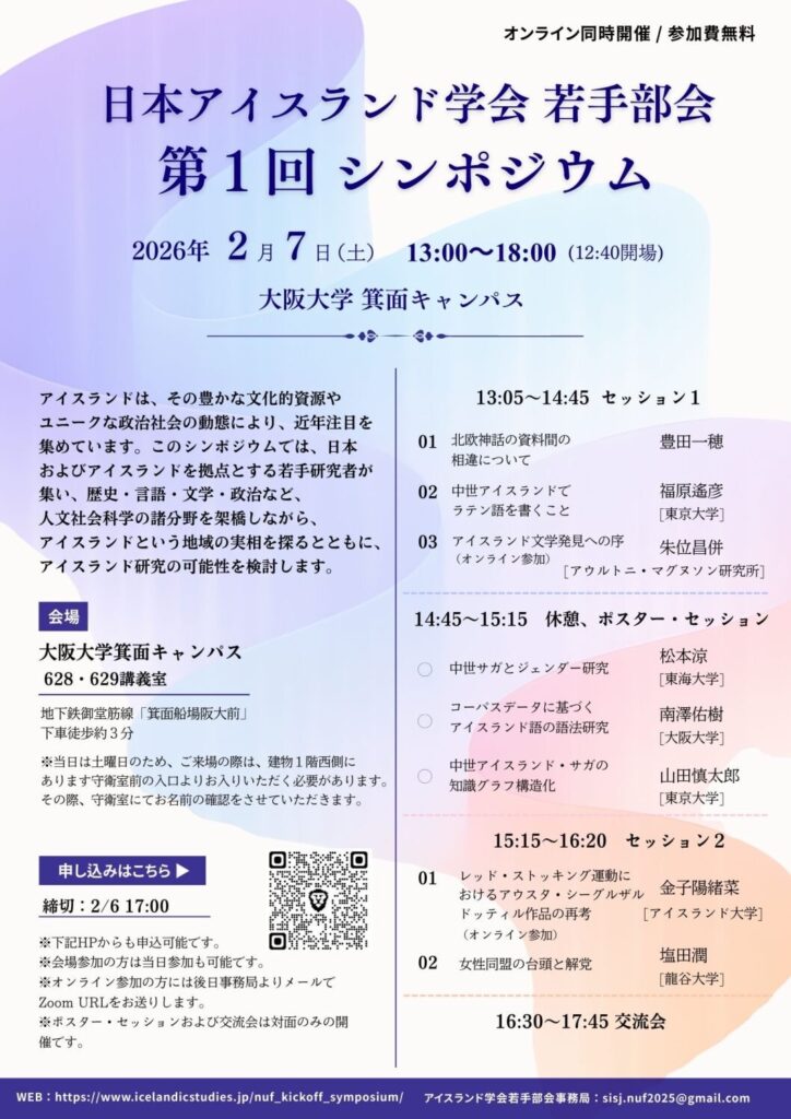 日本アイスランド学会若手部会による第1回シンポジウムを開催します。アイスランドは、その豊かな文化的資源やユニークな政治社会の動態により、近年注目を集めています。このシンポジウムでは、日本およびアイスランドを拠点とする若手研究者が集い、歴… -